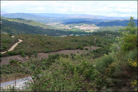 Weiter hinauf in die Berge, eine lange Gerade liegt hinter uns. Wir erreichen die Kreisgrenze nach Vila Pouca de Aguiar (Blick zurück).