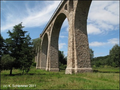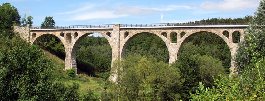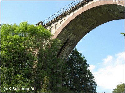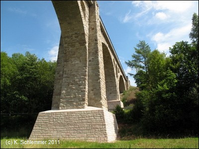 Eine Informationstafel erklärt die Geschichte: Von 1910 bis1913 erbaut, im 2. Weltkrieg zerstört, 1946 wieder aufgebaut. 7 Bögen von 25 m Spannweite, 193 m lang, 28 m hoch über demTal.