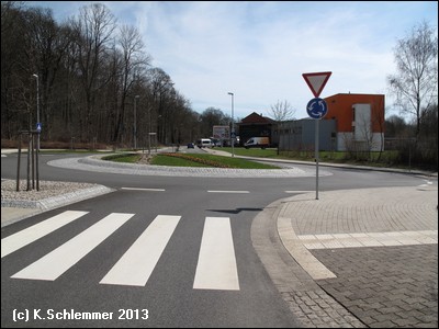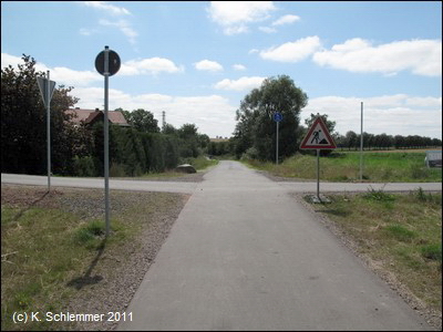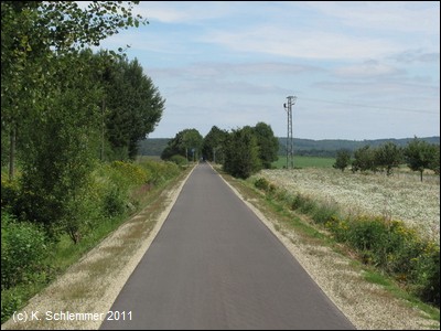 Danach überquert die Bundesstraße 251 die Trasse, hier wurde auch eine Zufahrt für die Radler eingerichtet. Die Kilometrierung der alten Bahnstrecke ist gut erhalten.