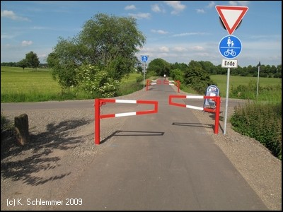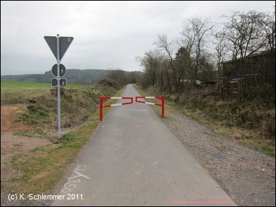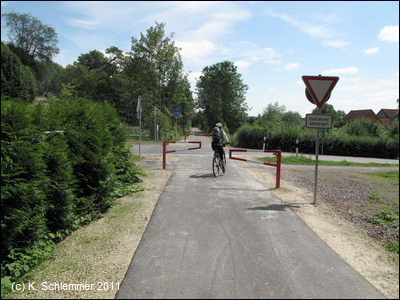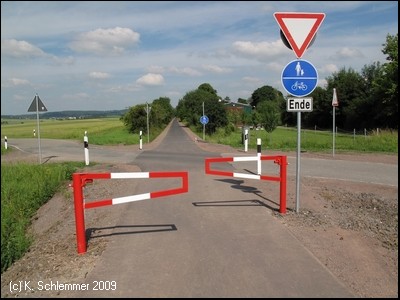 Wir folgen der Beschilderung des Hessischen Radfernwegs R5. Etwa 26 km feinster Bahntrassenradweg liegen nun vor uns. Leider hat man nicht auf Barrieren verzichtet, gleich zu Beginn die erste Sperre. Obwohl die kantigen Halbsperren recht weit auseinander stehen, sind bereits mancherorts Umfahrungsspuren sichtbar.