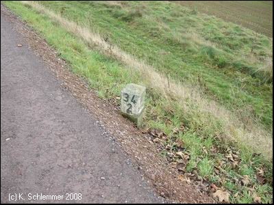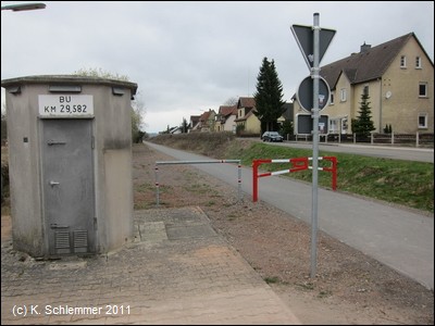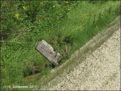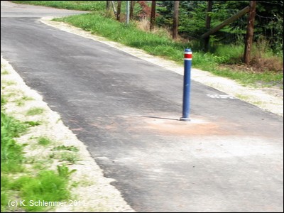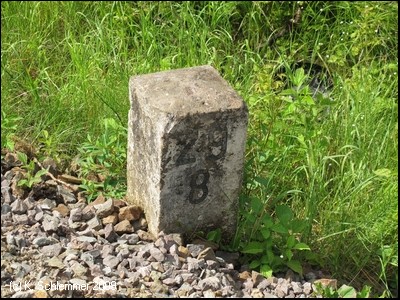 Nun geht es etwas bergab bis kurz hinter Meineringhausen. Auch hier wieder Sperren, wie gehabt, mit deutlichen Umfahrungsspuren! Am Rande der Strecke die alte Kilometrierung, etwas vernachlässigt aber immerhin stehen geblieben.