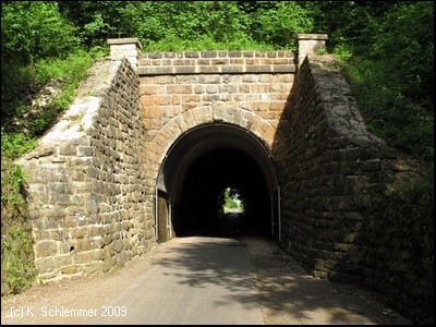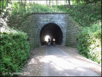 Das Westportal, schön renoviert. Immer noch aufwärts führt die Trasse.