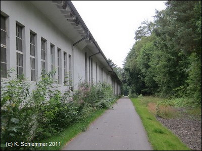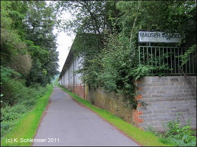 Bahnhof Waldeck (Blick zurück). Es geht an den leer stehenden Fabrikhallen der Mauserwerke vorbei.