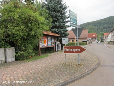Über die Kuppe, dann folgt man der Straße 1,5 km und knapp 60 Höhenmeter bergab nach Affoldern . Hier trifft man auf die stillgelegte Bahnstrecke Richtung Hemfurth, die teilweise als Draisinenstrecke genutzt wird. Der R 5 (Eder-Fulda-Werra) folgt dem Fluss talwärts, zur Staumauer geht es flussaufwärts.
