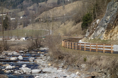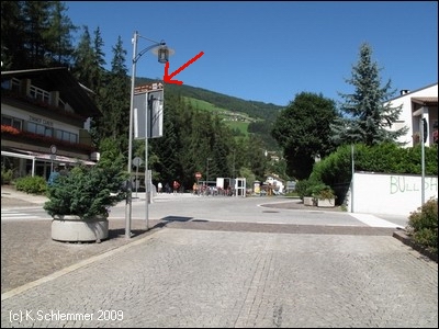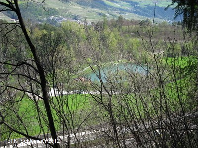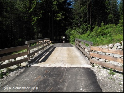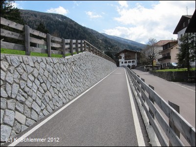 Dann ist man wieder auf der "alten" Strecke" weiter am Fluss entlang. Ein kurzes Stück weiter südlich, bei einer kleinen Brücke, erkennt man auf der linken Seite in der Ferne durch einen Einschnitt gerade noch einige schroffe Berge: die Gipfel von Wasserkofel, Torkofel und Furchetta der Geislerspitzen (Danke an Herrn Dr. Schürenberg für die Info!)