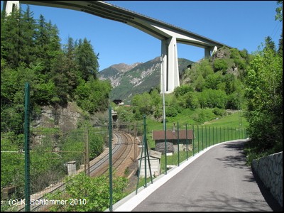 Die aktive Bahnstrecke verlässt das Tal und führt in den Tunnel. Wir fahren (am Hubschrauberlandeplatz) auf die breite, ausgebaute Trasse der alten Brennerbahn.
