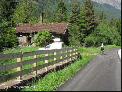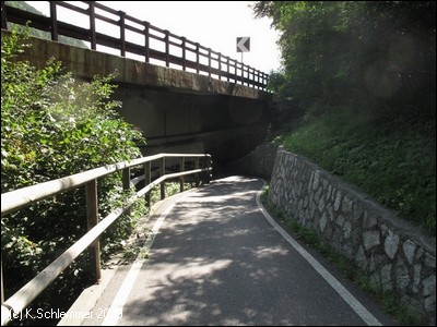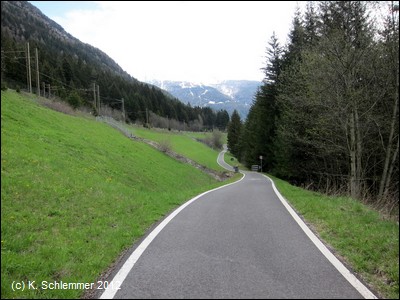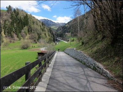 Dann biegt der Radweg wieder links ab und unterquert die Bahnstrecke. In flotter Fahrt bergab erreicht man Gossensass.