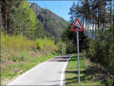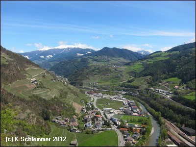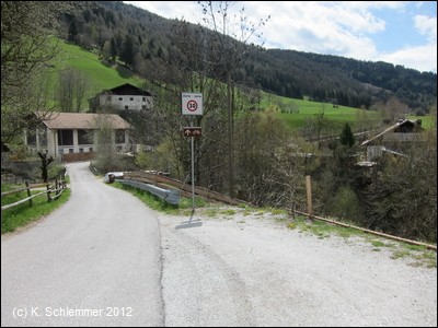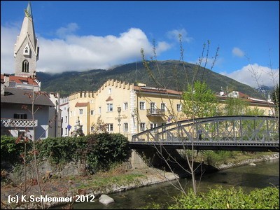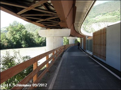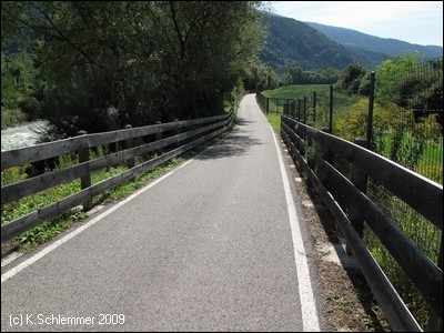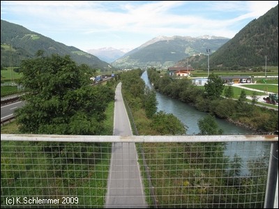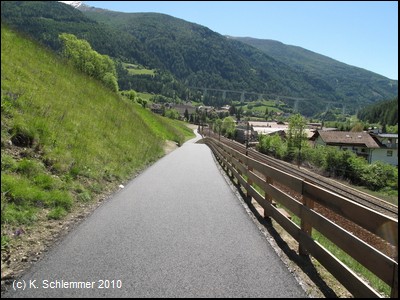 Hier zweigt der Radweg nach Bruneck ins Pustertall entlang des Rienzaflusses ab (kräftig bergauf!). Die Bahnstrecke ins Pustertal überquert das Tal auf einer Eisenbrücke.