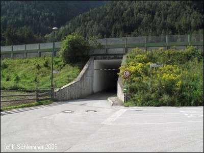 Die nächste "Röhre" (180 m lang) ist schon in Sichtweite. Wie ein riesiges Dach überspannt die Brennerautobahn die alte Bahntrasse.