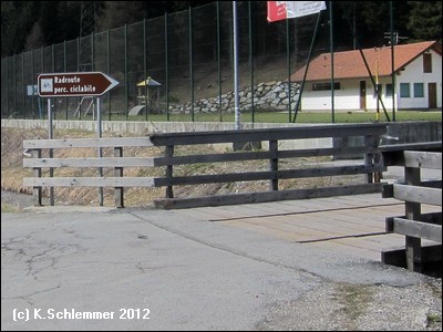 Die Beschilderung führt uns talwärts auf der linken Seite der Staatsstraße. Dann biegt der Radweg nach links ab, überquert einen Bach und folgt der Bahnlinie.