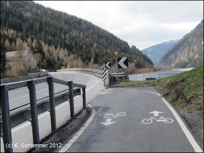 Der Abschnitt von Gossensass nach Sterzing (6,5 km) ist leider nicht so gut gelungen. Nach Überquerung der Brenner-Staatsstraße führt ein neuer, asphaltierter Radweg über Oberried und Unterried zum alten Zoll. Ein steiles Auf und Ab endet schließlich doch auf der Brennerstraße, etwa 1,5 km bis Sterzing muss man gefährliche Straße benutzen. Es wundert nicht, dass einige Radler gleich auf der Straße fahren.