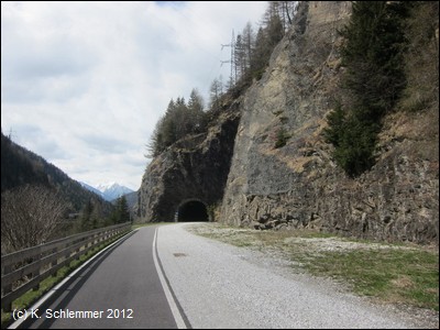 Der letzte Tunnel ("alter Pflerschtunnel") taucht auf: hier endet der Radweg auf der Bahntrasse, die Strecke biegt nach links ab. Eine kleine Anhöhe muss überwunden werden.