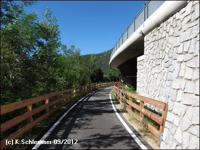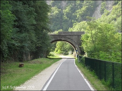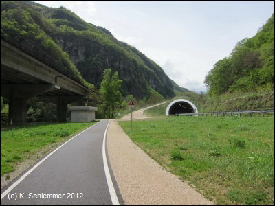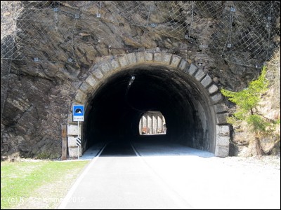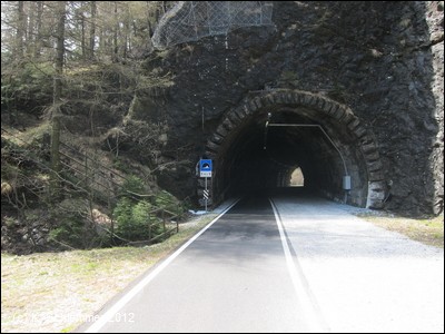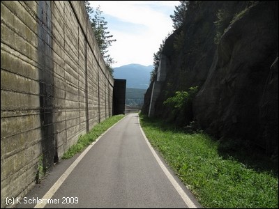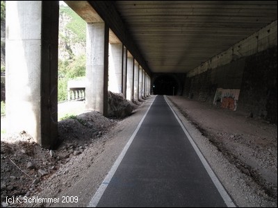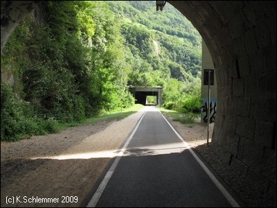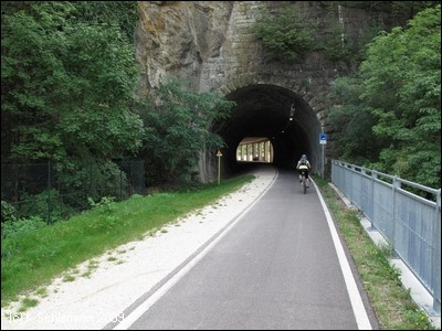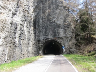 In Ponte Gardena (Waidbruck) erreicht man nun "endlich" den Radweg auf der alten Bahntrasse. Die Strecke ist zwischenzeitlich sehr gut ausgebaut, im September 2012 waren die Arbeiten weitgehendst abgeschlossen. Die Strecke führt durch 12 Tunnel (wenn ich richtig gezählt habe), die alle gut beleuchtet sind, wenn es nötig ist. Bei den kurzen Tunneln (einer ist nur 17 m lang) ist natürlich keine Beleuchtung nötig, aber in den langen (zwischen 120 und 500m) kann man sich über den tollen Ausbau freuen. Eine eigene Beleuchtung am Fahrrad ist aus Sicherheitsgründen dennoch dringend empfohlen!