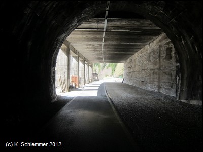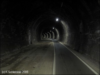 Der längste Tunel der Strecke beginnt (500m). Eine Ampelanlage regelt die Durchfahrt. Im Innern des Tunnel: eine der beiden Gleisbetten ist asphaltiert.