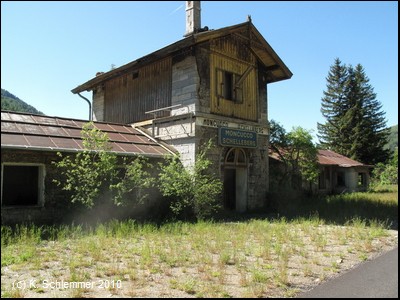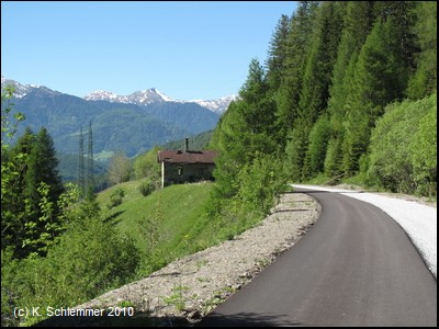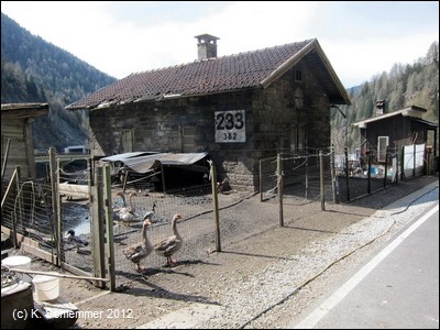 Am südlichen Tunnelausgang steht noch ein altes Bahnhäuschen: Kilometer 233 . Begleitet von Gänsegeschnatter rollen wir talwärts (Blick zurück).