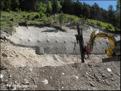 Die schroffe Felswand auf der südlichen Seite des Tunnels musste gegen Steinschlag gesichert werden. Die Berge des Pflerschtals kommen ins Blickfeld.