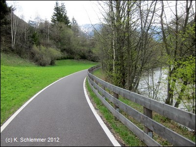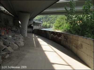 Musste man früher noch durch das Industriegebiet Brixen Süd fahren, so ist im letzten Jahr ein kurzes Stück Radweg neu gebaut worden: man fährt nun direkt am Eisack entlang unter den Brücken hindurch Richtung Bozen.