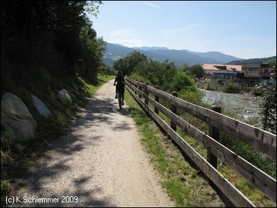 Nach der Brücke über den Eisack schwenkt der Radweg wieder rechts ab - Blick zurück Richtung Brenner.