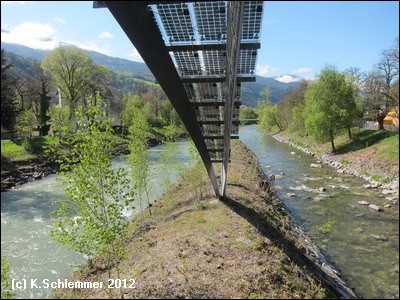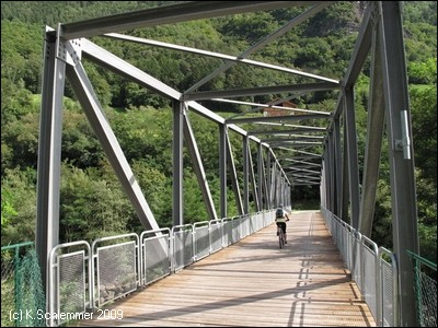 Eine doppelte Stahlkonstruktionsbrücke über den Fluss wurde für den Radweg genutzt. Der zweite Brückenteil wurde der Natur überlassen.