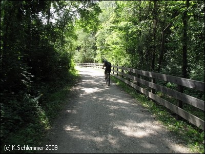 Das sieht schon sehr nach Eisenbahn aus! Ein aufwändiger Radweg ist auf dem rechten Gleisbett der alten Trasse entstanden.