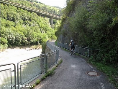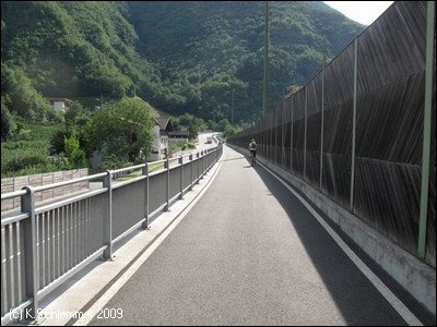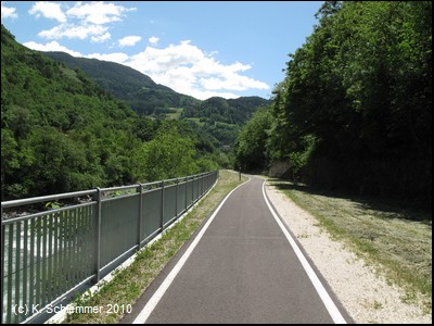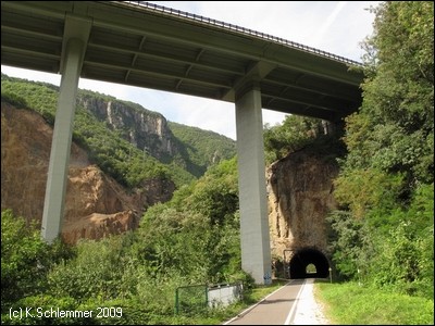 Noch eine kurze "Unebenheit" im Profil vor Waidbruck/Ponte Gardena, dann ist man auf der sehr gut ausgebauten Bahntrasse bis kurz vor Bozen. Der asphaltierte Radweg führt durch etliche Tunnel, im engen Eisacktal immer am Rande des Flusses. Hoch oben, auf Stelzen gebaut, begleitet uns die Brennerautobahn. Ohne Mühe erreicht man auf dem gut ausgebauten Radweg den Bahnhof und die Stadt Bozen.