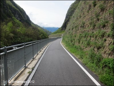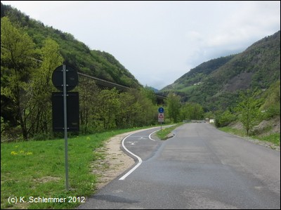 In Mezzaselva wechselt der Radweg unter der Autobahn durch auf die andere Talseite. ZUnächst führt der radweg an der Straße entlang, dann führt eine Brücke über die Staatsstraße.