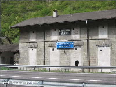 Die Schilder sind noch erhalten. Der Blick von hier ins Tal ist atemberaubend - die auf Stelzen geführte Brennerautobahn überragt den Ort Gossensass.