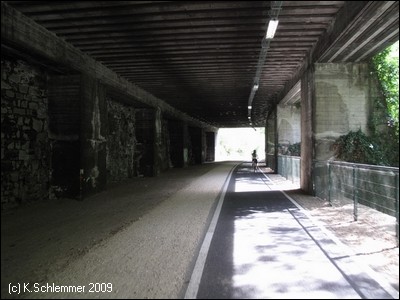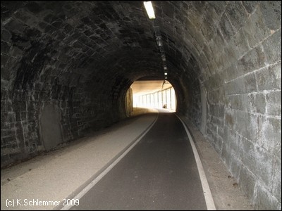 Der asphaltierte Radweg verläuft auf der linken Seite der breiten, 130 m langen Röhre. Ausfahrt aus dem Tunnel!