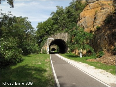 Aber auch sehr kurze Tunnel kommen vor - dieser ist nur 17 m lang. Den Wegweisern folgen, man fährt zum Bahnhof Blumau und dann links ab.