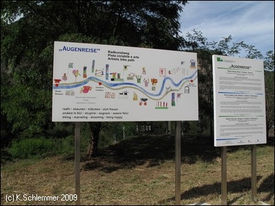 Es geht ein Stück an der Straße entlang, auch hier ist der neue Radweg aufwändig gestaltet und abgesichert. Auf den folgenden Kilometern begleitet den Radler ein Kunstprojekt: "Augenreise"