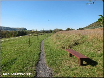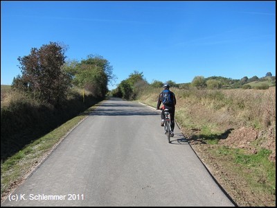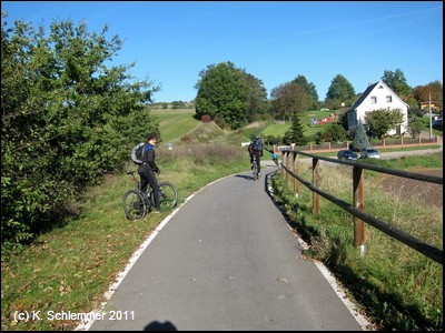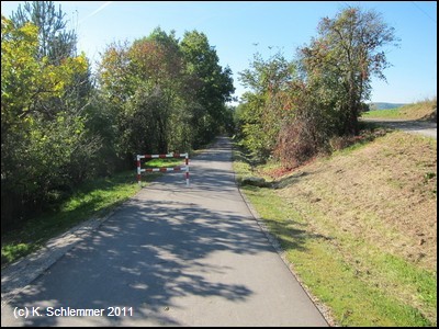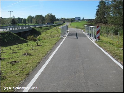 Am Ort vorbei hat man ein kleines Stück Trasse asphaltiert. Danach, über die Felder und am Straßenrand entlang, ist es nur noch ein schmaler Pfad.