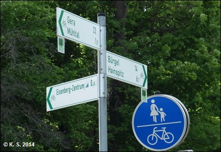 Schon ab Gera ist die Zufahrt beschildert (Richtung Mühltal). D4 Route und derThüringer Städtekette Radweg benutzen die gleiche Strecke bis nach Kursdorf.