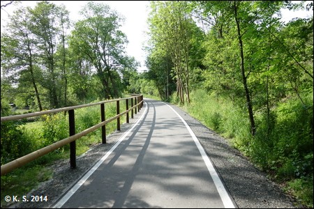 Ein toller Radweg führt uns leicht bergauf. Die Kreuzungen sind inzwischen barrierefrei, die Pfostensperren sind verschwunden.