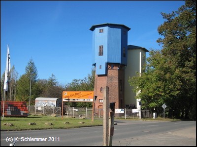 Auch ein Wasserturm ist aus der Eisenbahnzeit noch übrig geblieben. Die Abfahrt beginnt, halbseitige Sperren begrenzen die Zufahrt für Autos.