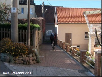 Blick zurück: In Kursdorf: Hier fehlt wohl eine Brücke. Wir sind am Abzweig des Mühltalsweg/Thüringer Städtekette Richtung Bad Klosterlausnitz. Eine Rampe führt wieder hinauf auf die Bahntrasse.