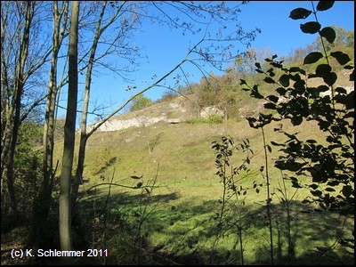 Durch eine Allee und vorbei an den kahlen Felshängen geht es auf Graitschen zu.