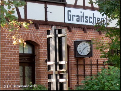 Am Bahnhof Graitschen hat man ein kleines Eisenbahndenkmal errichtet. Die alte Bahnhofsuhr hat die Zeit überdauert.