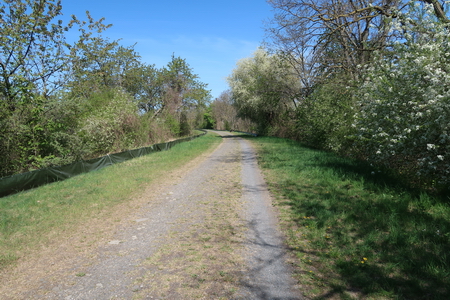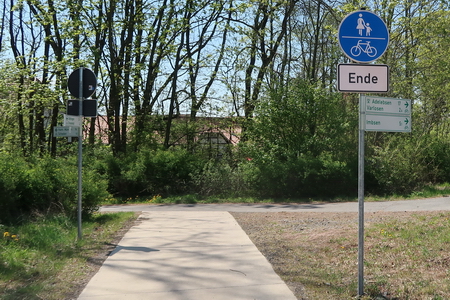 Die Trasse verläuft auf einem flachen Damm, das Ende des Ausbaus kommt recht unvermittelt an einem Querweg.