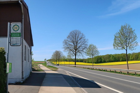 An der Straße entlang führt ein gut ausgebauter Radweg, geschützt durch die Leitplanke. Hier, vor dem früheren Gasthof Rischenkrug, kreuzte die Bahnstrecke die Straße.