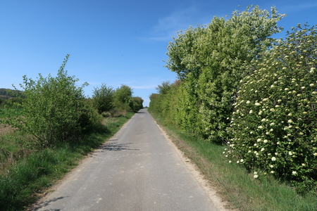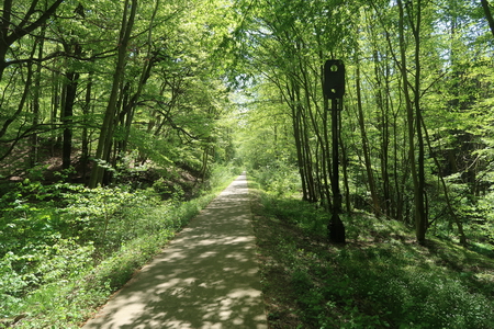 Dieser Abschnitt verdient den Namen Radweg, fern vom Autoverkehr durch eine grüne Landschaft. Auch hier stehen noch die Steine der Kilometrierung.