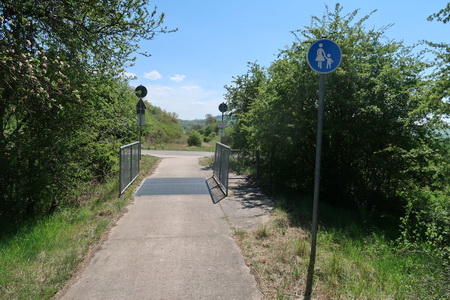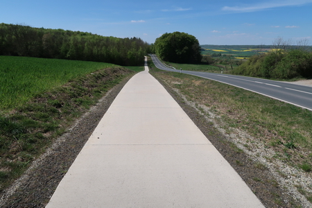 Kerzengerade aufwärts durch den flachen Einschnitt geht die Fahrt, bis man die B3 erreicht. Hier verlässt der Radeg die Bahntrasse.