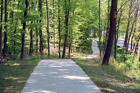 Man erkennt das Schotterbett der alten Bahnstrecke, das ungenutztin die Landschaft durchquert. Der neue Radweg hingegen nimmt einen achterbahnähnlichen Verlauf.