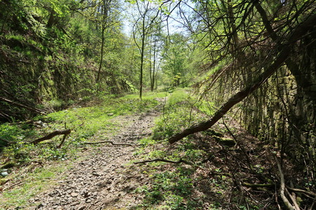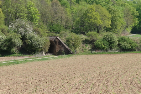 Vergessen im Wald oberhalb von Volkmarshausen liegt der gleichnamige Tunnel. Etwas mühsam den Waldweg hinauf erreicht man die zugewachsene Bahntrasse. Der Tunnel verläuft in einer leichten Kurve von Süden nach Osten, die Länge beträgt etwa 325 m .