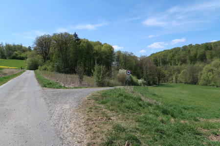 Doch schon nach knapp 500 m ist wieder Schluss mit dem Radweg. Kein Verkehrsschild regelt die unübersichliche Situation bei abbiegenden Autos an der Straße nach Klein-Wiershausen, die hier als Fahrradstrecke dient. Man folgt dem kleinen Wegweiser links ab den Berg hinauf. Dafür gibt es am nächsten Abzweig einen Schilderwald.