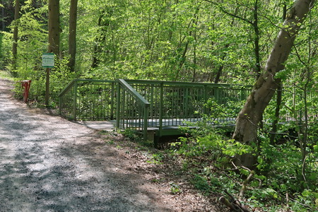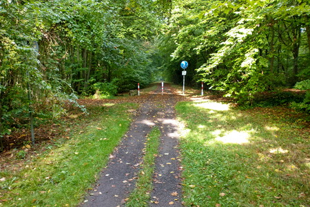 Der Radweg hat bereits ordentlich an Höhe gewonnen, dieser Abschnitt ist Teil des Weser-Harz-Heide Radfernwegs . Vorbei an den wegen Verschmutzung schlecht lesbaren und in Schieflage geratenen Wegweisern, führt die ruppige Fahrbahn weiter aufwärts. Nur zwei schmale Fahrstreifen sind übrig geblieben, aber die breite Trasse ist zumindest gemäht. Schließlich erreicht man ein Waldgebiet. Immer noch stehen hier die unfallträchtigen Pfostensperren.