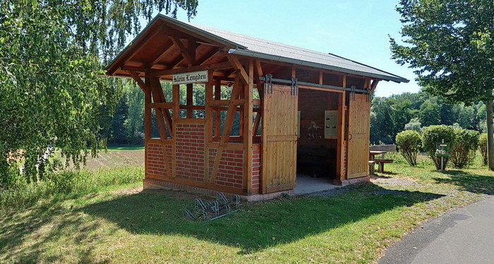 Das originelle Bahnhofsgebäude von Klein Lengden wurde in Anlehnung an das abgerissene Original gegenüber neu erstellt. Im Inneren findet man Informationen zur Bahnstrecke. NB: Nur der gut gemeinte "Felgenkiller"-Fahrradständer ruft nach einem ordentlichen Bügel.