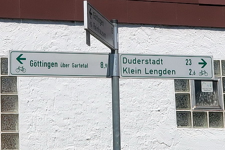 Der Radler muss sich nun entscheiden: Folgt er den Wegweisern, geht es zügig über den Berg nach Nesselröden. Hierdurch wird die Schleife der Bahnstrecke abgekürzt. Wer der Gartetalbahn folgen will, kann noch ein Stück die alte Trasse benutzen. In Nesselröden treffen sich die beiden Strecken wieder. Zunächst entlang der Nathe erreicht mann ach gut 5 km Radweg Westerode. Dort trifft man auf die ebenfalls stillgelegte Bahnlinie Duderstadt - Wulften. Abseits der Bahntrassen fährt man nach Duderstadt. Auf einem kurzen Stück ist die Trasse der Gartetalbahn noch befahrbar, am Bahnhof Duderstadt, - heute privat genutzt - endet die Fahrt. Der Kleinbahnhof ist nicht mehr vorhanden, das Areal ist überbaut.