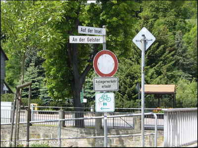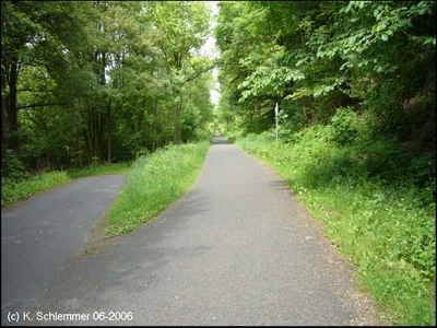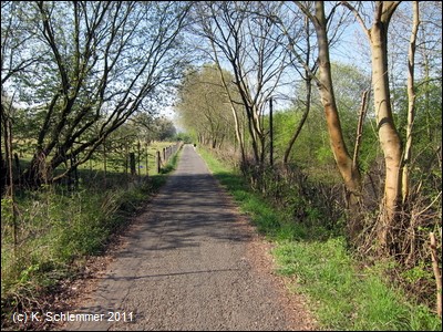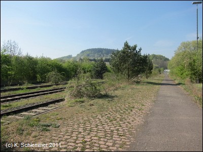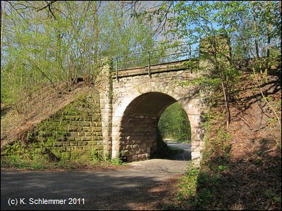 Vorbei an zwei Durchlässen folgen wir der Bahnstrecke. Der Radweg ist Teilstrecke des Herkules-Wartburg-Radwegs, auch wenn die Schilder so verschmutzt sind, dass man sie kaum noch lesen kann (2011)
