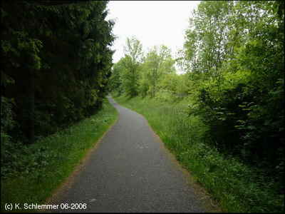 Leicht bergauf und wieder bergab folgt der Radweg der alten Bahnstrecke, die rechts des Radwegs brach liegt.