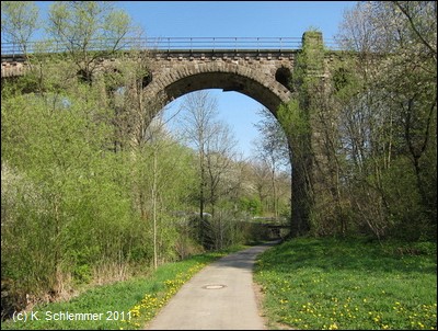 Ein kurzes Stück an der Straße entlang, dann wieder links zum Bach hinab (gut beschildert!). Dann verlässt der Radweg den Verlauf der Bahnstrecke. Wer zum Viadukt will, muss geradeaus weiterfahren, durch das Tal des Laudenbach Richtung Uengsterode.